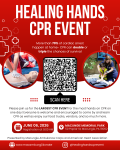 Macungie Ambulance Corps is hosting a CPR Training event at Macungie Memorial Park, June 6th, 2026. See advertisment and additional information below.